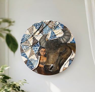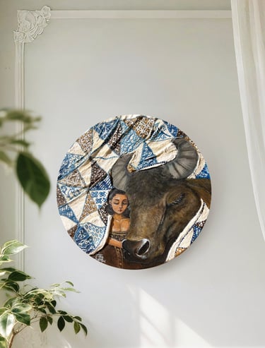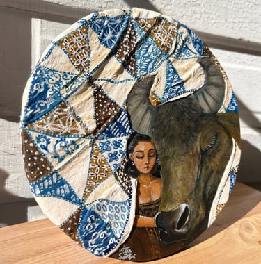Both the woman and the water buffalo are draped in blankets adorned with Batik Tambal, a traditional Indonesian fabric whose name means “to patch up.” Long ago, this fabric was used to cover those who were ill, symbolizing care and protection. Recovering tells a story of gentle restoration and the tender moments that help us mend what has been broken.