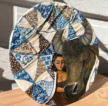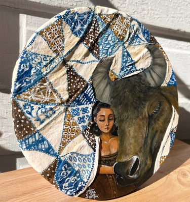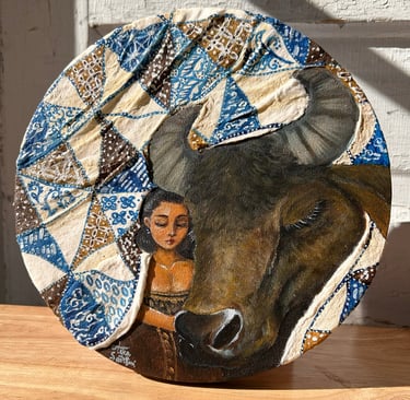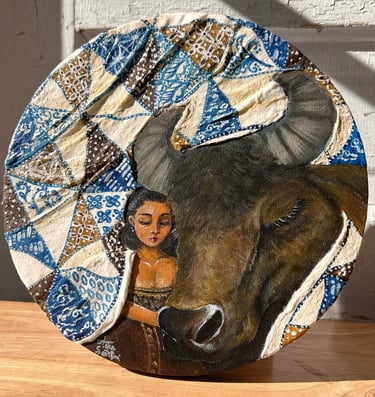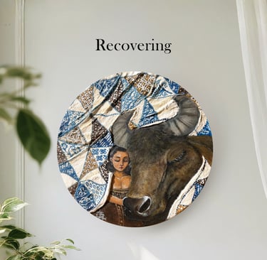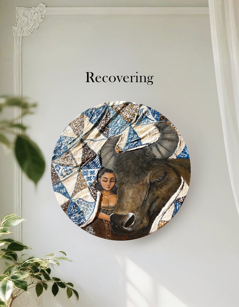 Both the woman and the water buffalo are draped in blankets adorned with Batik Tambal, a traditional Indonesian fabric whose name means “to patch up.” Long ago, this fabric was used to cover those who were ill, symbolizing care and protection. Recovering tells a story of gentle restoration and the tender moments that help us mend what has been broken.